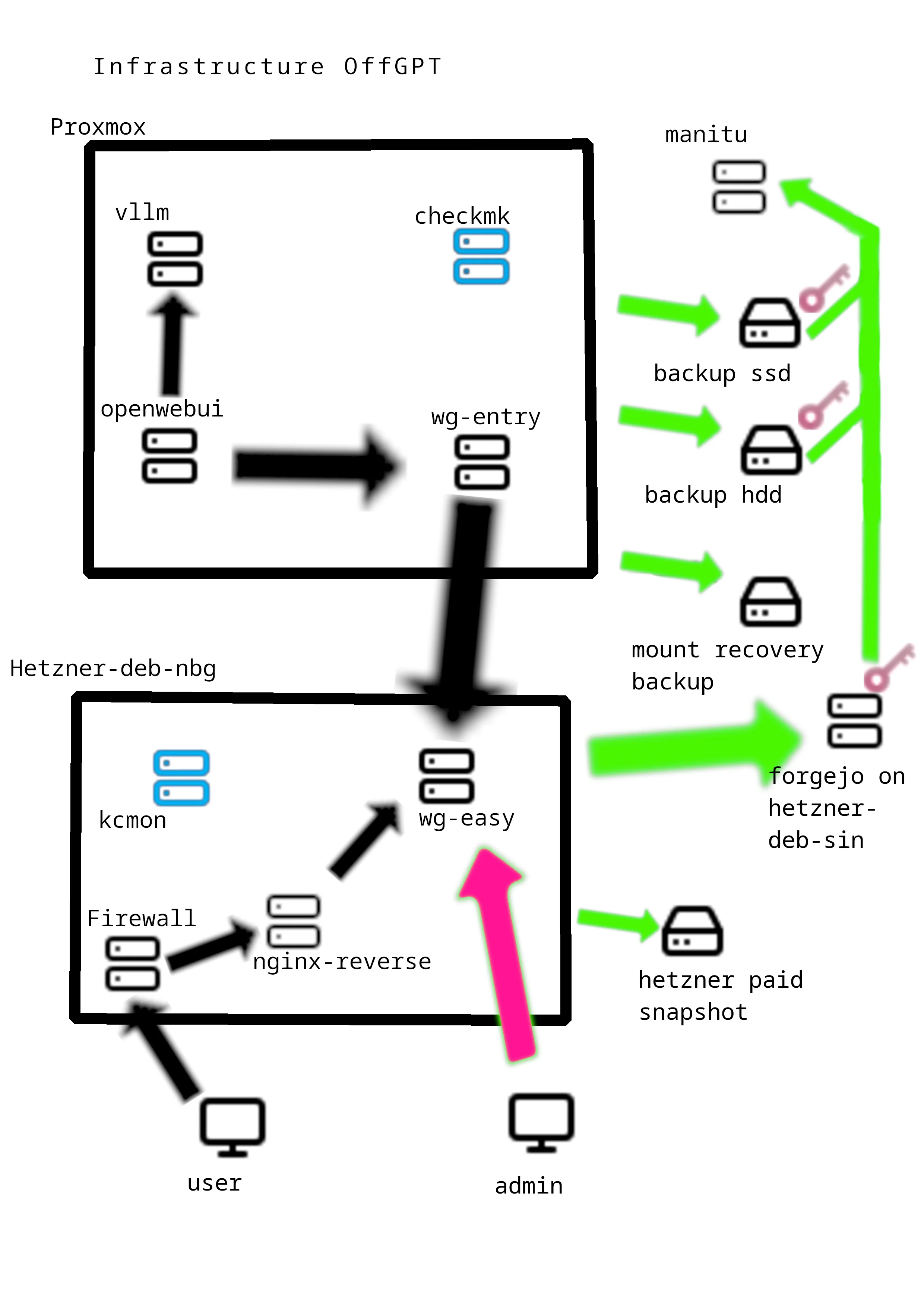 The overall architecture of offgpt can be summarized with the following graphic. The pink keys indicate that the backups get encrypted before being sent. The forgejo server in singapore only gets non user data related configurations backuped into private repositories: